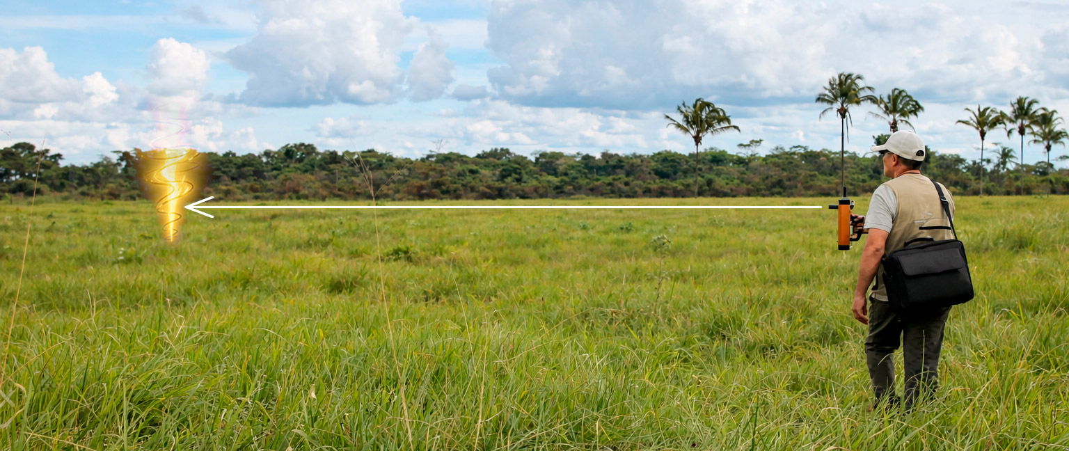 Porque ele trabalha com tecnologia direcional iônica, focada em alvos antigos e profundos, exatamente onde estão os grandes achados. Em vez de ficar varrendo o chão metro por metro, você aponta, direciona e vai direto ao alvo.